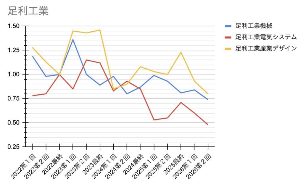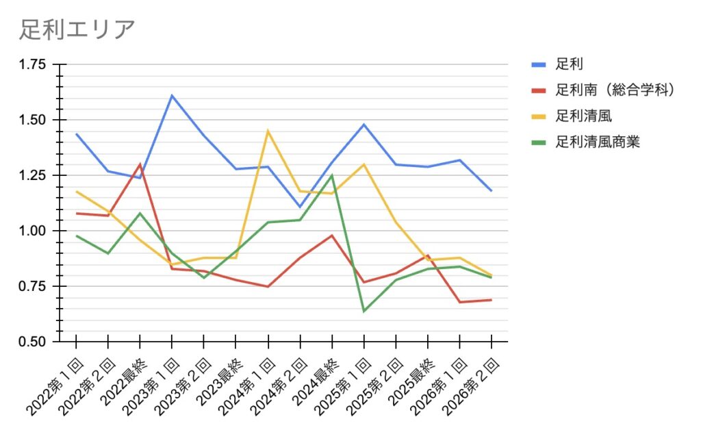 - 足利高等学校:倍率1.18(過去4年間の最終倍率の平均1.28)
