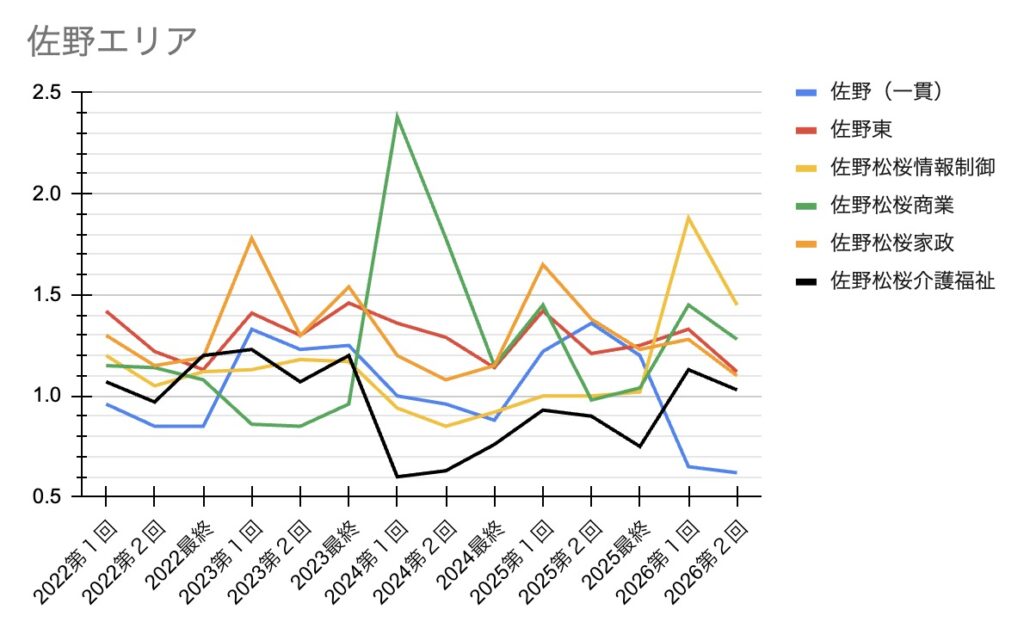 佐野高等学校は、グラフ上では一番倍率が低くなっていますが、2021年度入試ではもっと低い倍率がありました。
