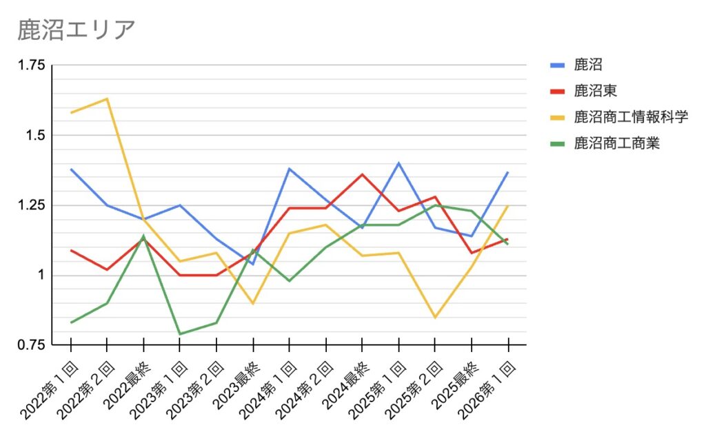 | 鹿沼商工 (情報科学) | 40 | 1.58 | 1.63 | 1.20 | 1.05 | 1.08 | 0.90 | 1.15 | 1.18 | 1.10 | 1.08 | 0.85 | 1.03 | 1.25 |