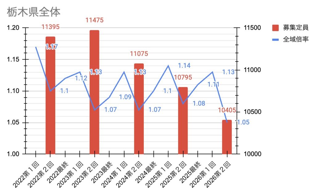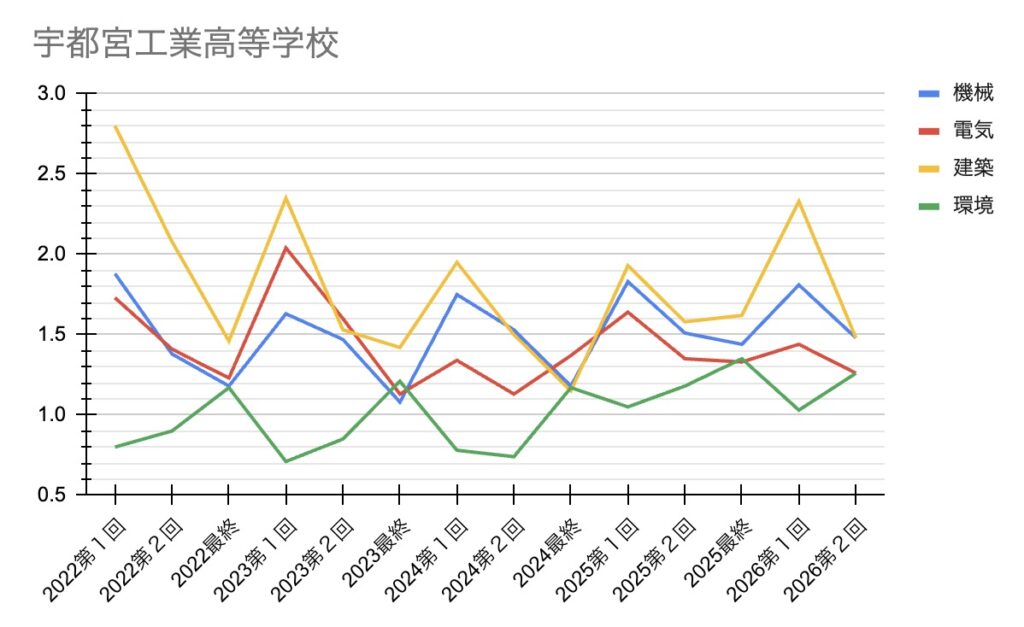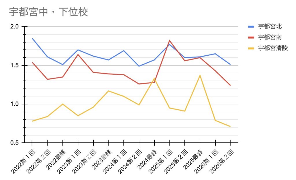 - 宇都宮北高等学校:倍率1.51(過去4年間の最終倍率の平均1.57)