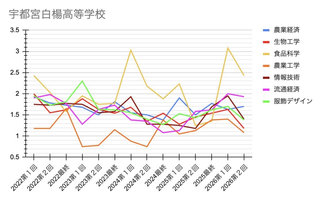 - 宇都宮高等学校:倍率1.22(過去4年間の最終倍率の平均1.23)