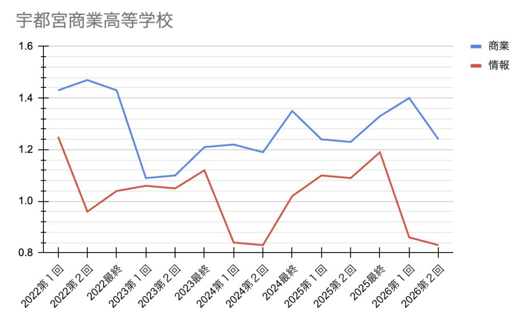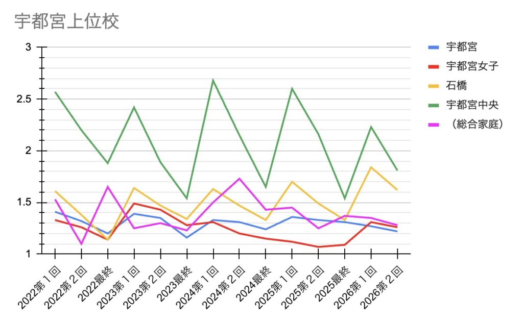 - 宇都宮女子高等学校:倍率1.26(過去4年間の最終倍率の平均1.17)