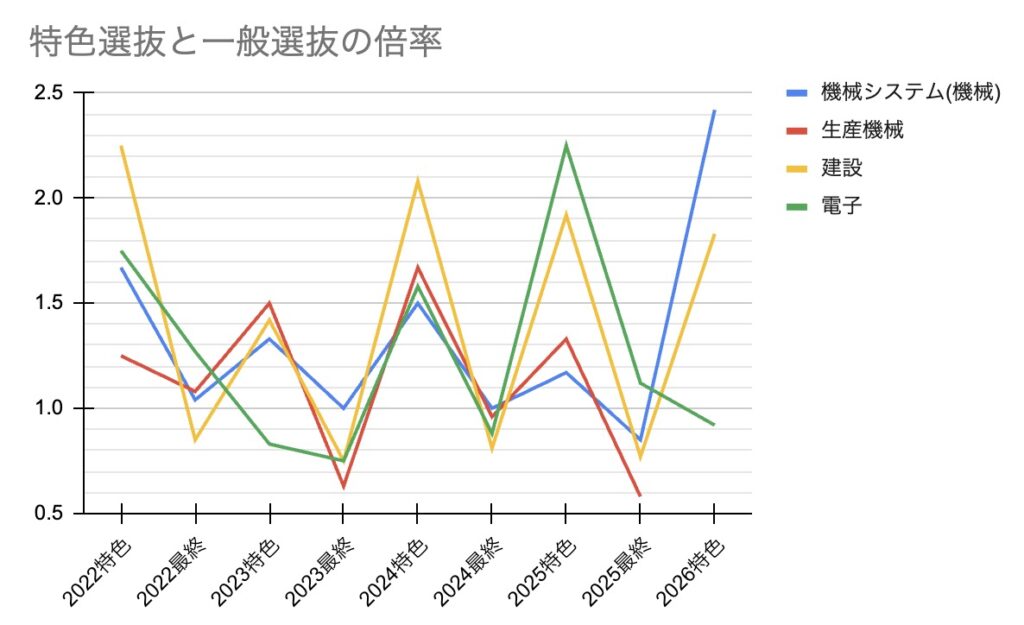 • 電子:倍率0.92(過去4年間の特色選抜倍率の平均1.60 最終倍率の平均1.03)