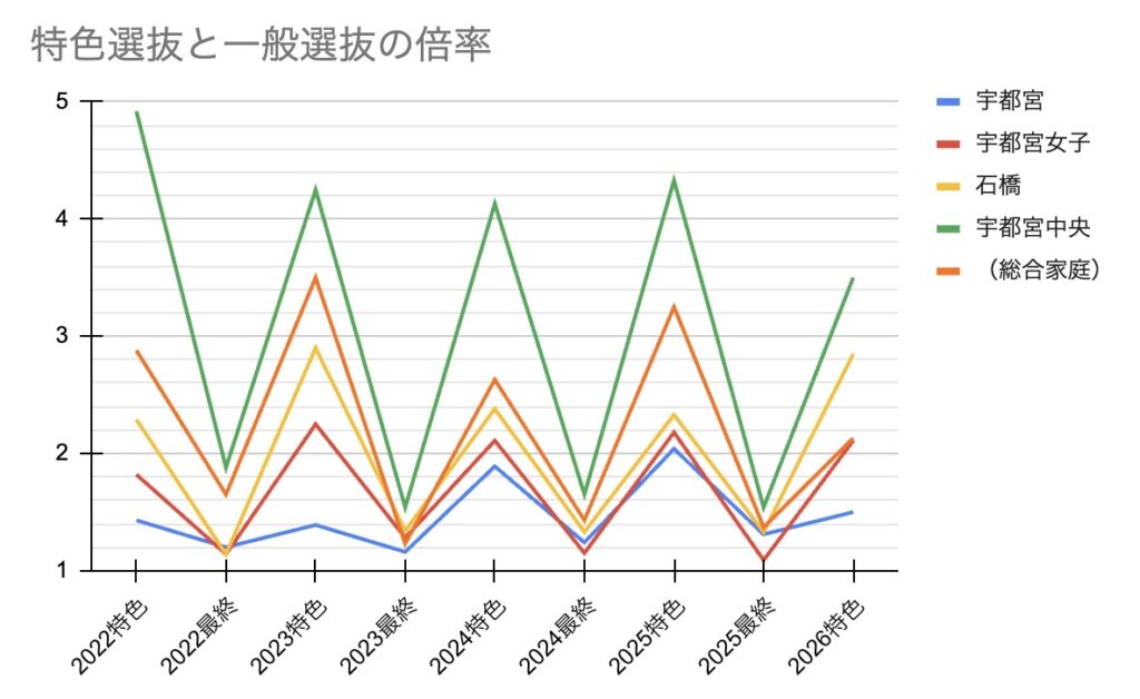 • 宇都宮高等学校:倍率1.50(過去4年間の特色選抜倍率の平均1.65 最終倍率の平均1.23)