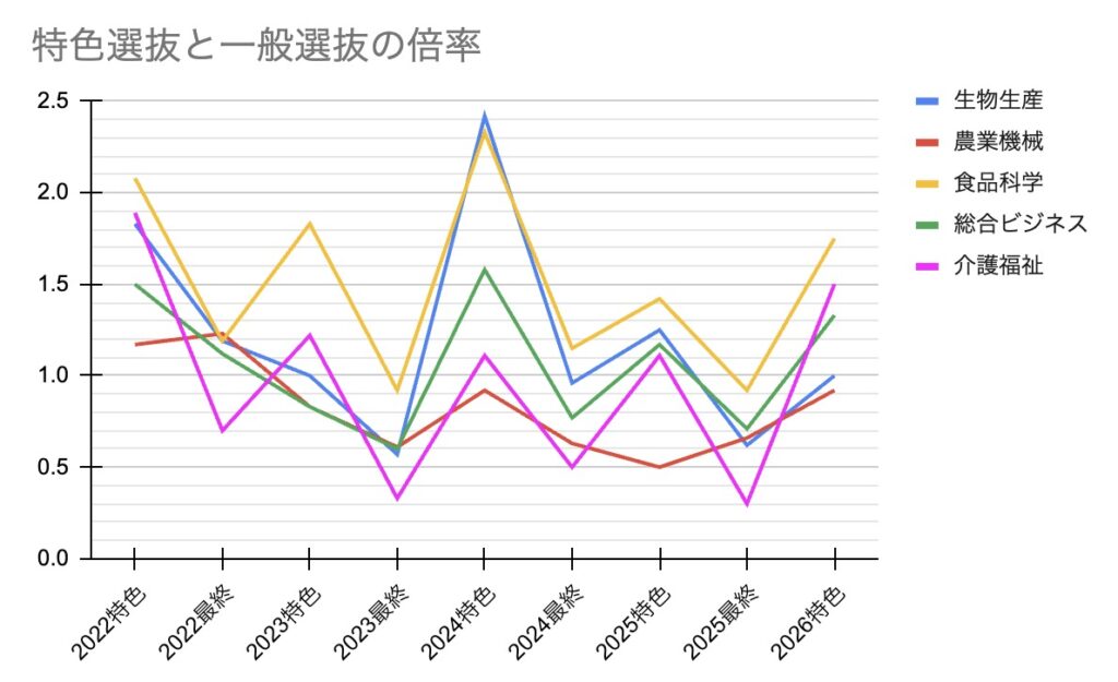 • 食料科学:倍率1.75(過去4年間の特色選抜倍率の平均1.92 最終倍率の平均1.05)