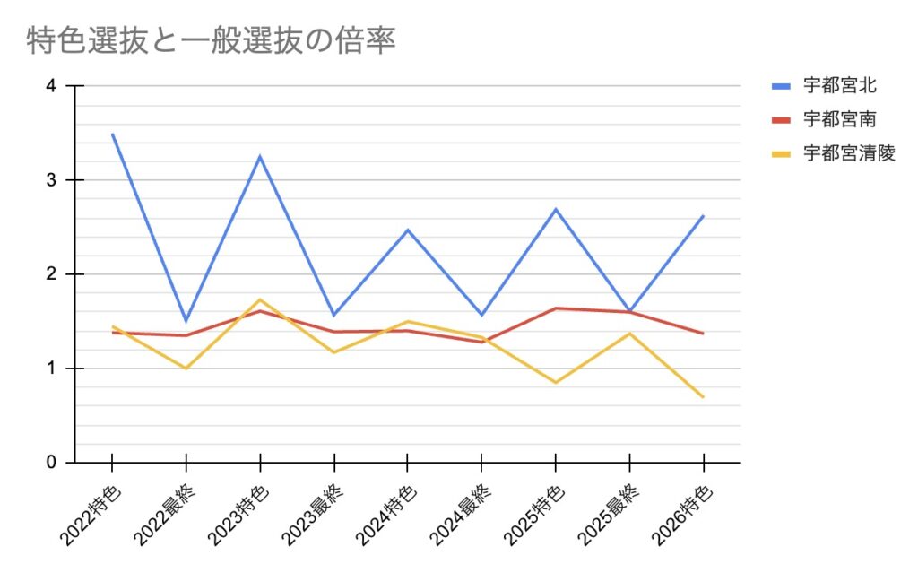 宇都宮北高等学校は、ここのところ3倍までは超えなくなっています。