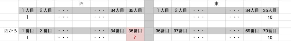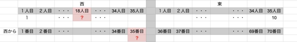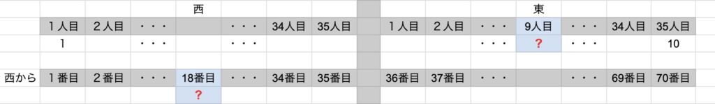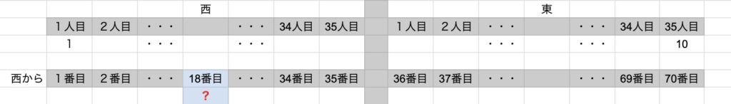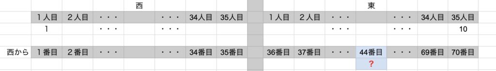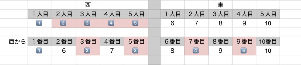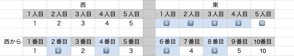 東側の西から1人目は西から2番目。東側の西から2人目は西から4番目・・・