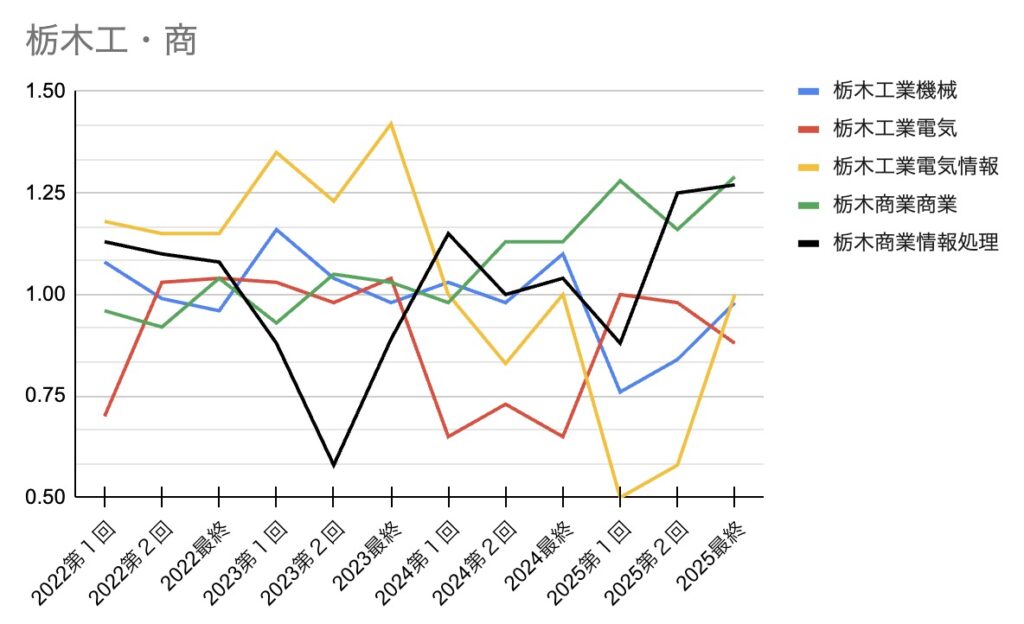 栃木工業高等学校は、ここのところどの学科も定員前後となっています。